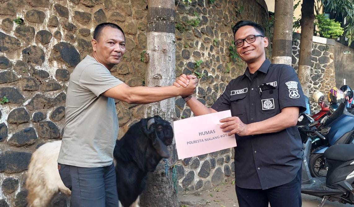 Hewan kurban seekor kambing tersebut dari Kapolresta Malang Kota, Kombes Pol Nanang Haryono, SH, SIK, MSi, yang diserahkan secara langsung Kasi Humas Polresta Malang Kota, Ipda Yudi Risdiyanto, kepada Ketua PWI Malang Raya Ir Cahyono.