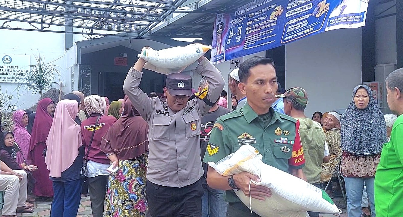 Kepedulian Pak Bhabin Aipda Firman terlihat saat monitoring pembagian bantuan pangan berupa beras alokasi bulan Juni dan Juli 2025 di Kelurahan Arjosari, Kecamatan Blimbing, Kota Malang, (Kamis, 25/07).