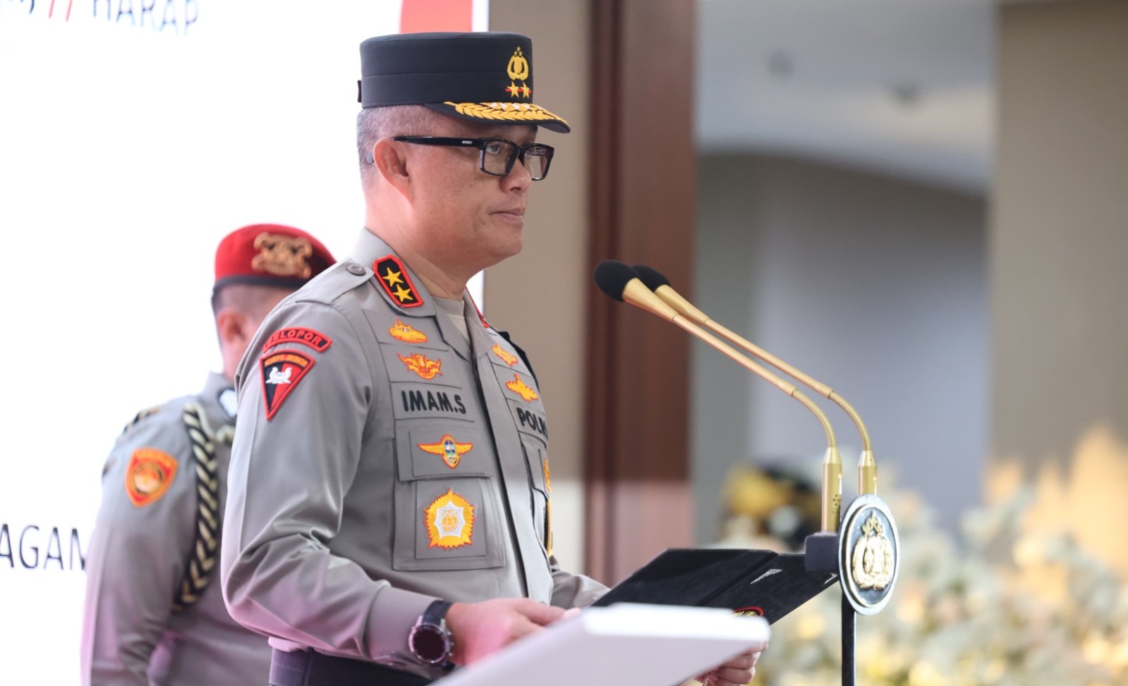 SURABAYA – Kapolda Jawa Timur Irjen Pol. Drs Imam Sugianto,M.Si didampingi Waka Polda Jatim Brigjen Pol Pasma Royce bersama pejabat utama (PJU) Polda Jatim, memimpin Upacara serah terima jabatan (sertijab) Irwasda Polda Jatim, di Gedung Patuh Lantai II, Mapolda Jatim, Senin (9/12/2024).