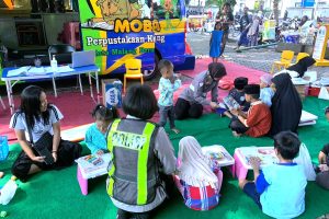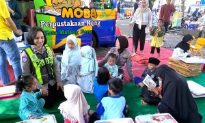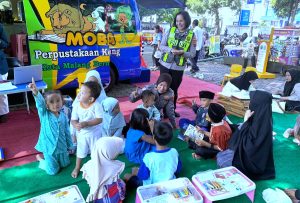 Pendekatan humanis “Polisi Sahabat Anak” ini para polantas menghampiri pengunjung yang saat itu berkumpul di taman baca perpustakaan keliling Pemkot Malang yang ada di Alun-Alun Merdeka, Kota Malang. (Rabu, 03/07).