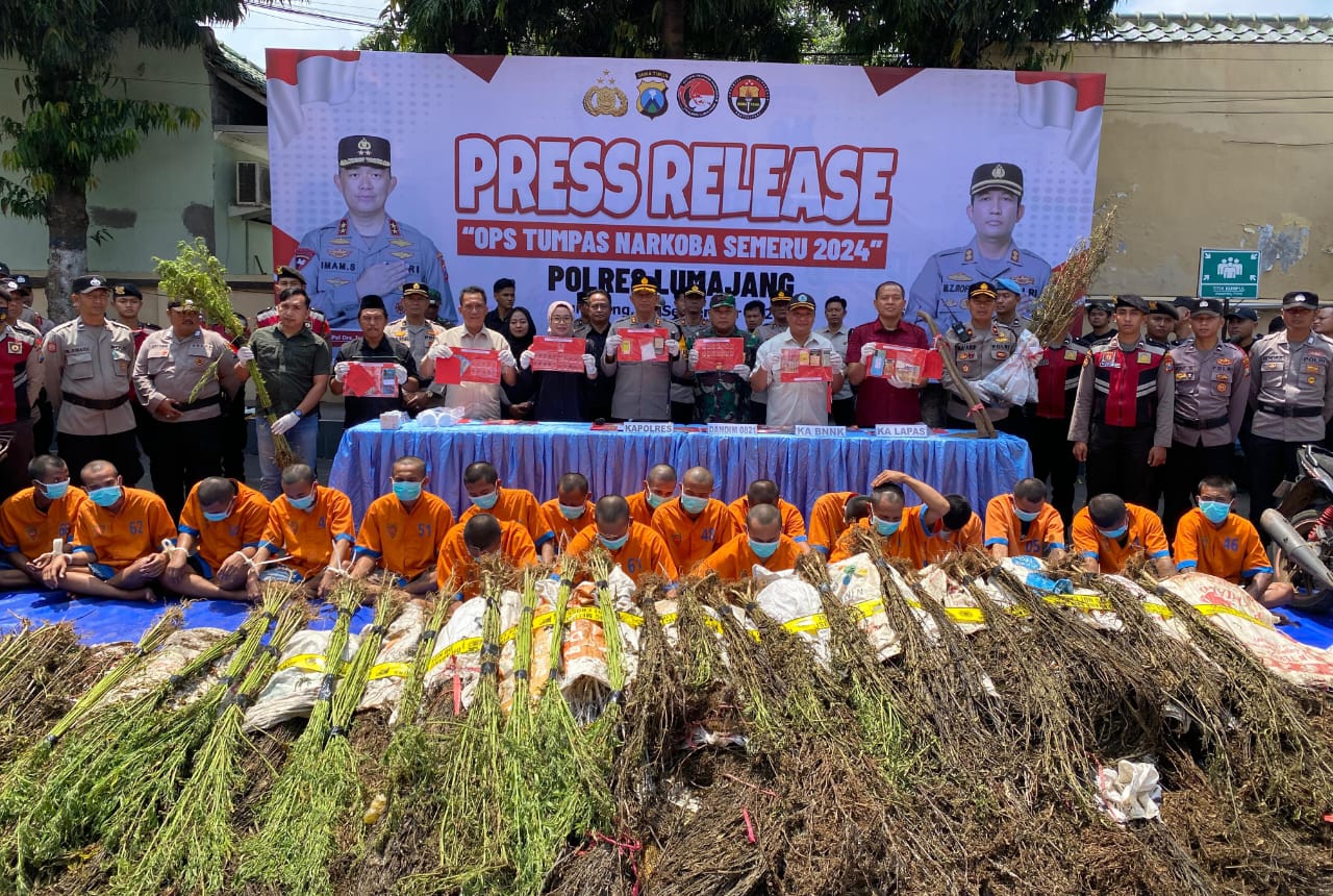 “20 tersangka kasus narkoba ini perannya adalah pengedar dan penanam ganja,” ujar Kapolres Lumajang AKBP Mohammad Zainur Rofik, S.I.K, Senin (30/9).