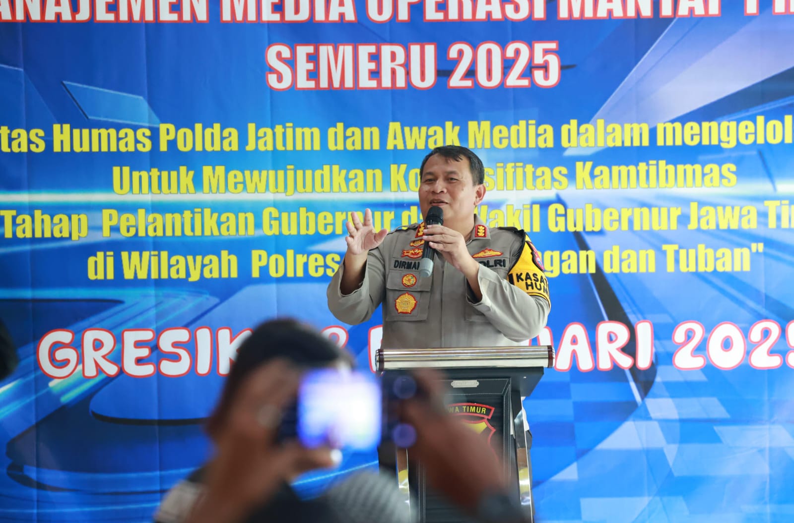 Ajakan tersebut disampaikan oleh Kepala Bidang Hubungan Masyarakat (Kabidhumas) Polda Jatim,Kombes Pol Dirmanto dalam acara ‘Manajemen Media Operasi Mantap Praja Semeru 2025’ yang berlangsung di Gresik, pada Rabu (12/2/2025).