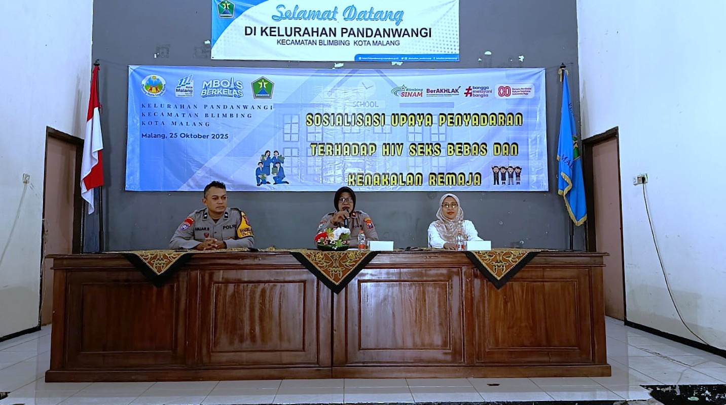 KOTA MALANG — Upaya membangun kesadaran dan kepedulian generasi muda terhadap kesehatan dan perilaku sosial, Satuan Pembinaan Masyarakat (Satbinmas) Polresta Malang Kota sosialisasi penyadaran terhadap HIV, seks bebas dan kenakalan remaja kepada anggota OSIS SMP Negeri 14 dan SMP Negeri 24 Kota Malang, di Aula Kelurahan Pandanwangi, Jl. Simpang Teluk Grajagan.