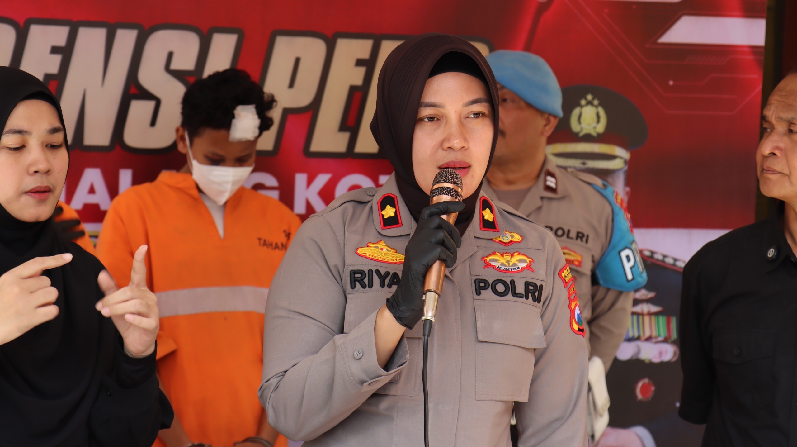 Kapolsek Sukun Kompol Riyan Wahyuningtiyas, didampingi Wakapolsek, Kasi Humas Polresta Malang Kota dan Kanit Reskrim AKP Wardi Waluyo gelar konferensi Pers di Lobi POlsek Sukun. (Jumat, 01/08).
