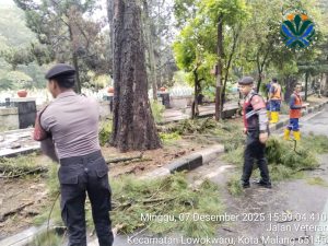 Polsek KLojen – Upaya menjaga kamtibmas dan memastikan arus lalu lintas tetap lancar dan aman, Kapolsek Klojen Kompol Moch. Budiarto, S.H., bersama Kanit, anggota Shabara, dan Bhabinkamtibmas Aiptu Sapto gerak cepat tangani patahnya ranting pohon cemara di Jl Veteran,