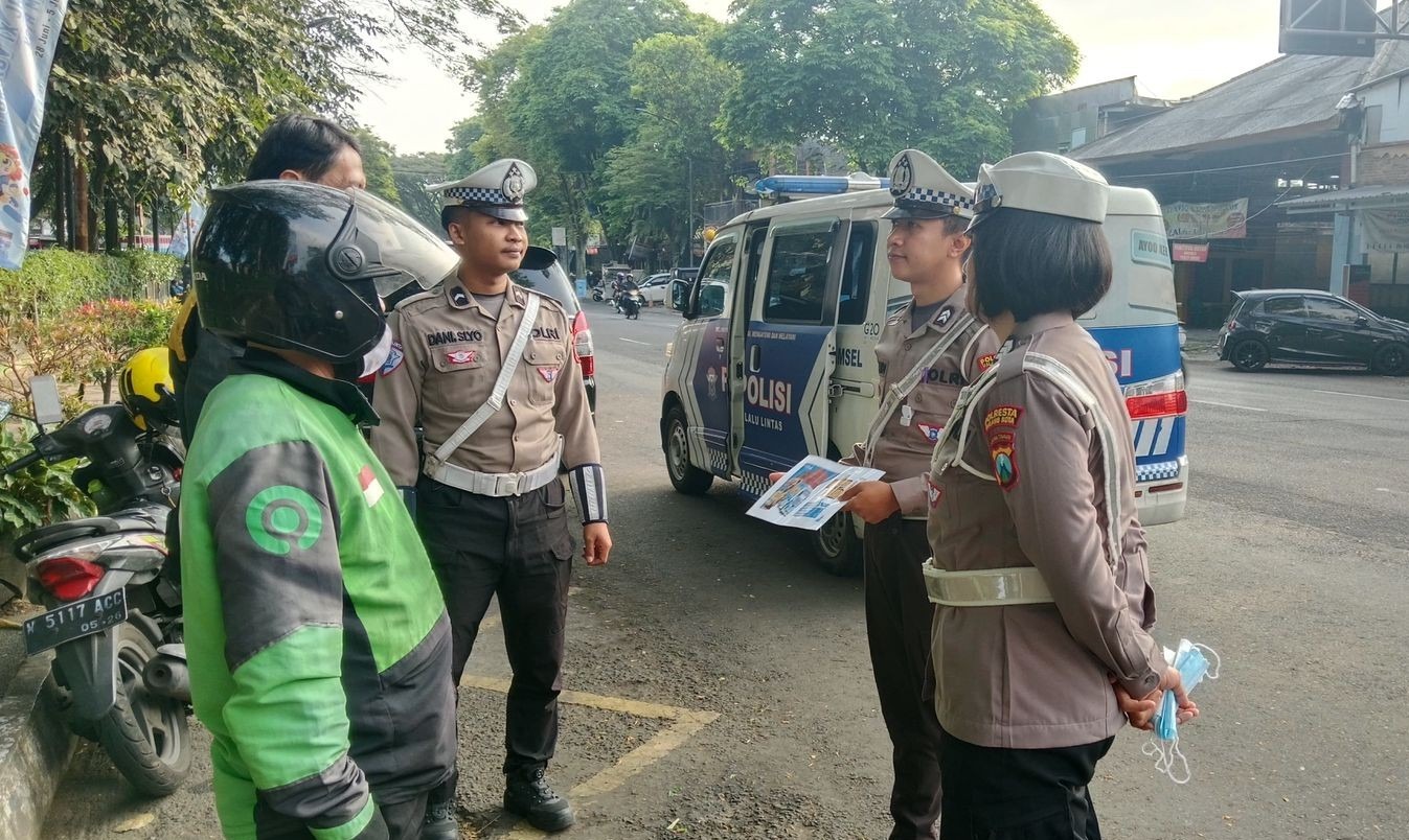 KOTA MALANG – Dalam rangka meningkatkan kesadaran dan kepatuhan masyarakat terhadap aturan lalu lintas, Unit Keamanan dan Keselamatan (Kamsel) Satlantas Polresta Malang Kota melaksanakan kegiatan Penerangan Keliling (Penling) tertib berlalu lintas kepada para pengemudi ojek online (ojol) yang mangkal di kawasan Taman Trunojoyo, tepat di depan Stasiun Kota Baru Malang.